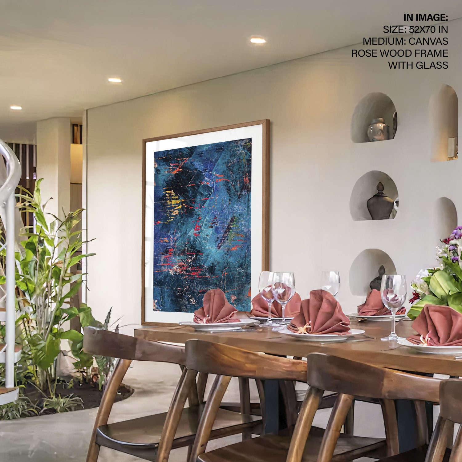 We recommend using Canvas for prominent living spaces (living room, dining hall, bedrooms), Metal/Glass for modern aesthetics, and Art Paper for galleries, bathrooms, kitchens, and other less formal areas.
