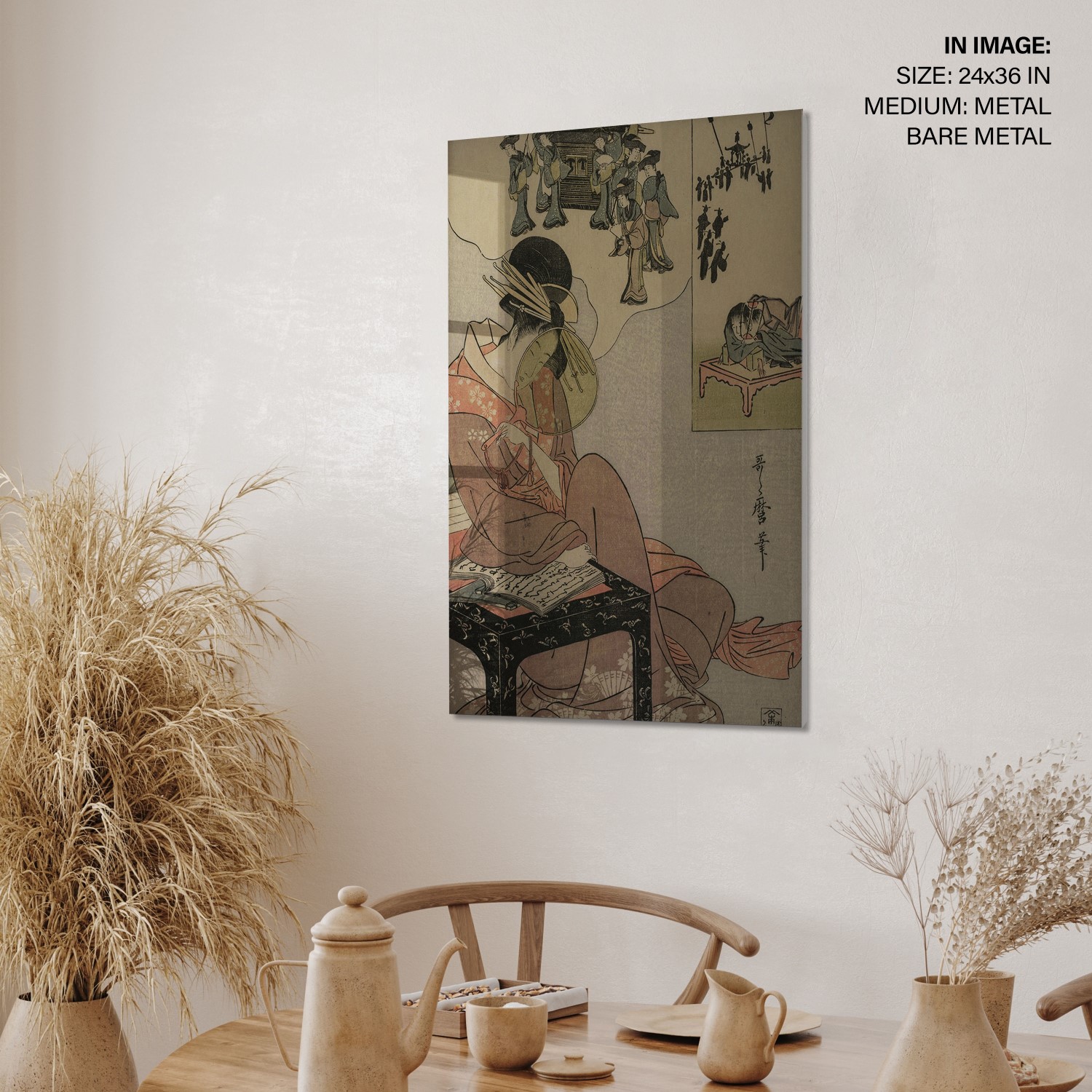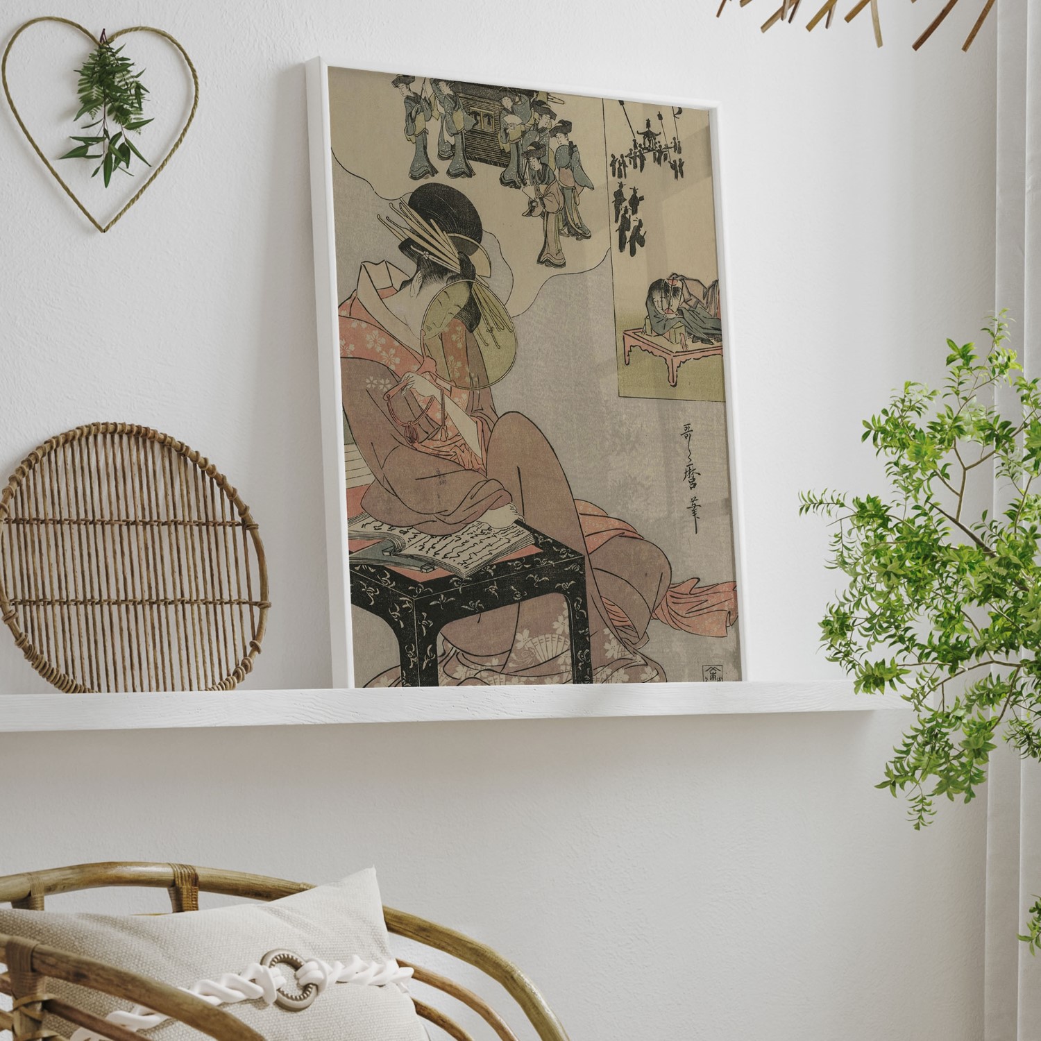 Courtesan Dreaming of a Marriage Procession is a color woodblock print created by Kitagawa Utamaro in the late 1790s. The print depicts a courtesan who is lost in thought, dreaming of a marriage procession. The courtesan is dressed in a beautiful kim