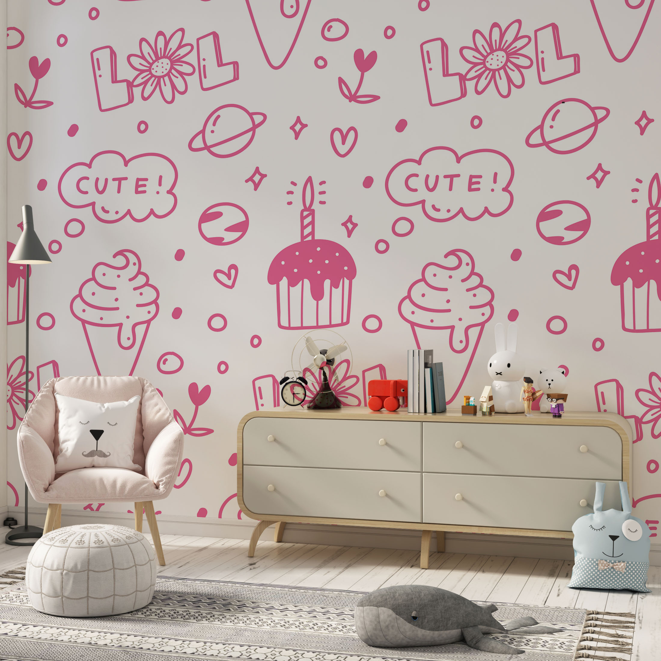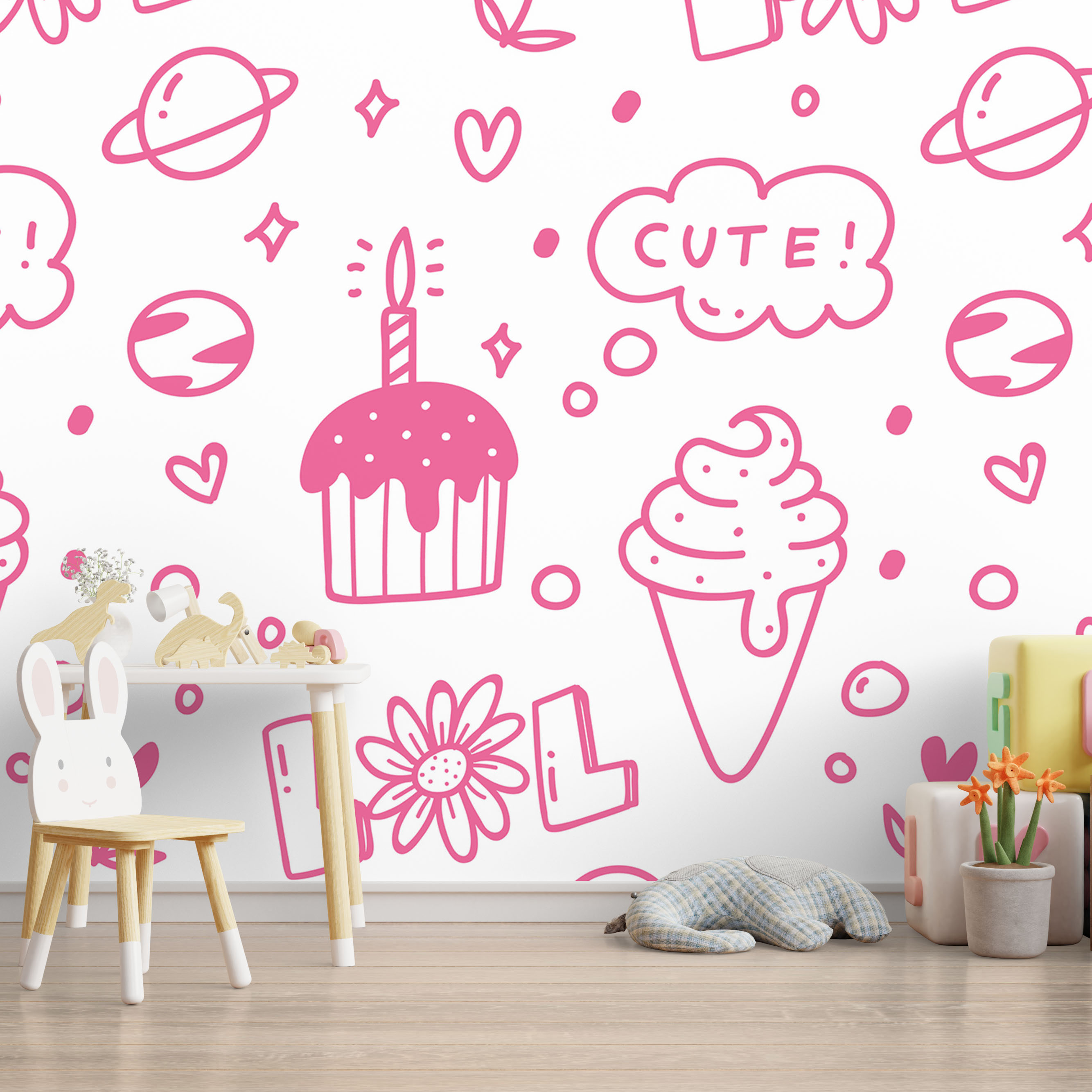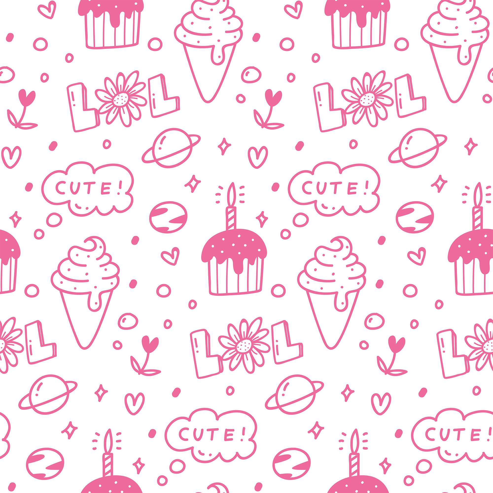 Cute seameless pink cake and ice-cream line drawing