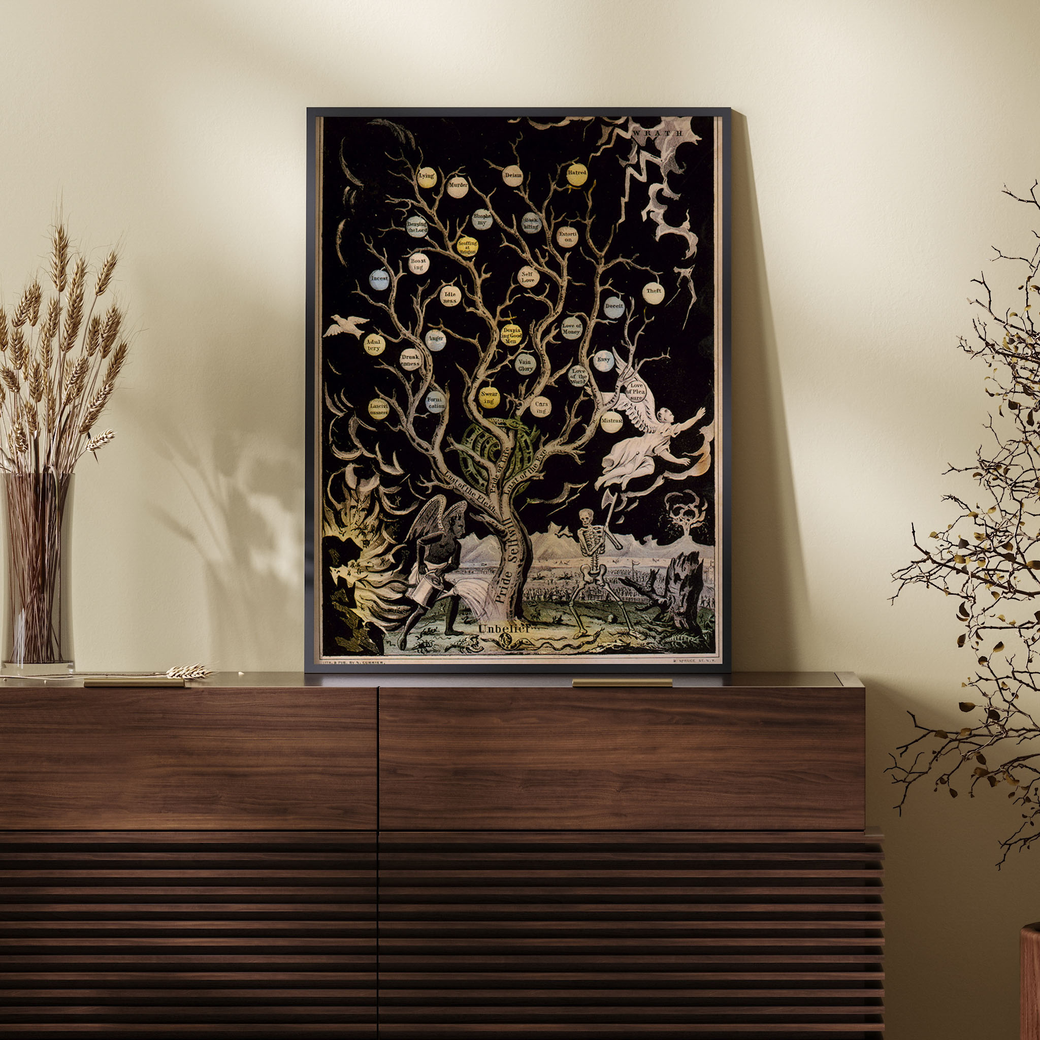 Devil watering tree of sins and skeleton about to chop it down by Currier and Ives (1845)