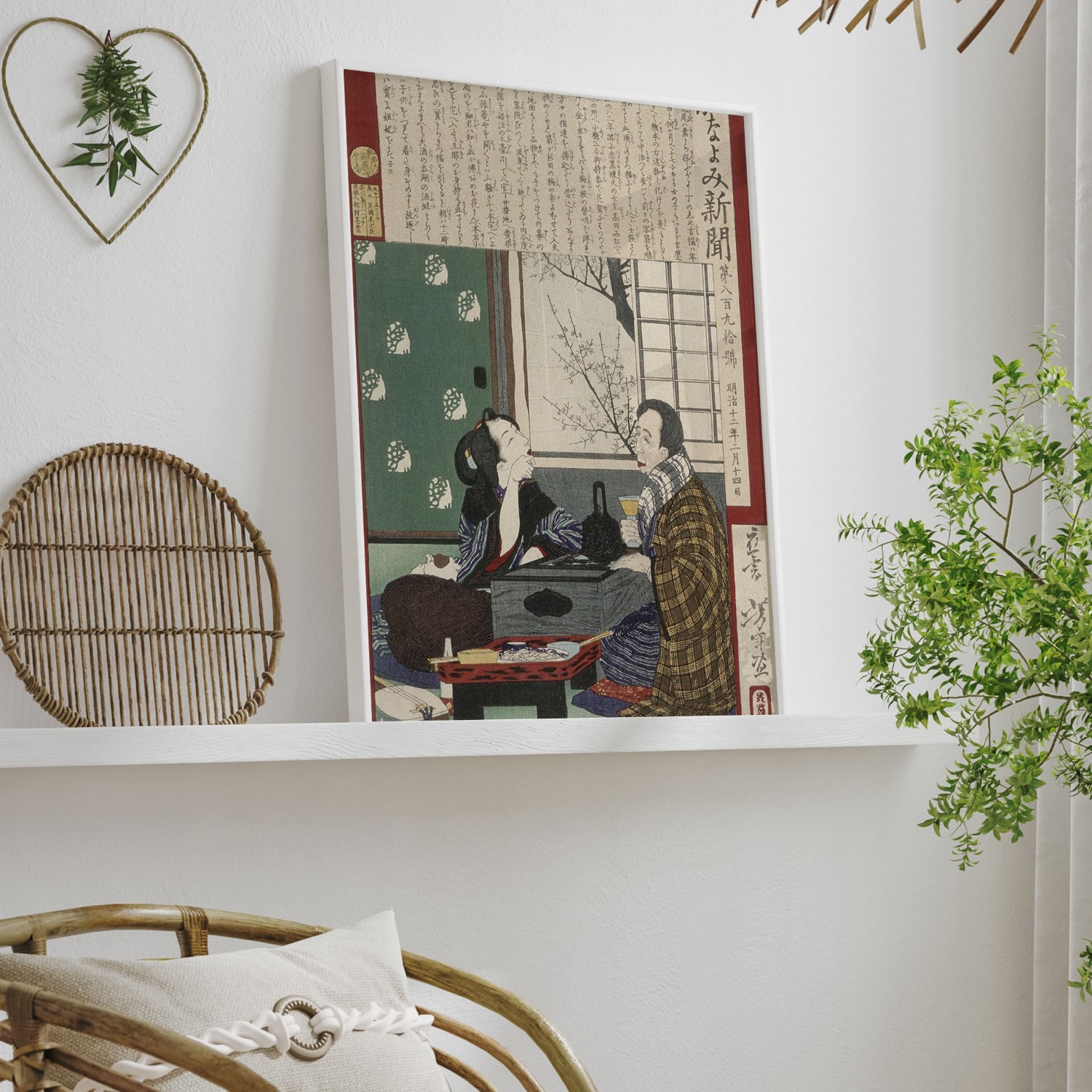 This color woodblock print, created by Tsukioka Yoshitoshi in 1879, depicts a couple by a window. The man is a dissolute drinker, as indicated by his disheveled appearance and the sake bottle in his hand. The woman looks on with a mixture of concern and resignation. The print is part of The Kanayomi Newspaper series, specifically number 890. It measures 13 11/16 x 9 3/16 inches and is housed in the Herbert R. Cole Collection. Its accession number is M.84.31.224.