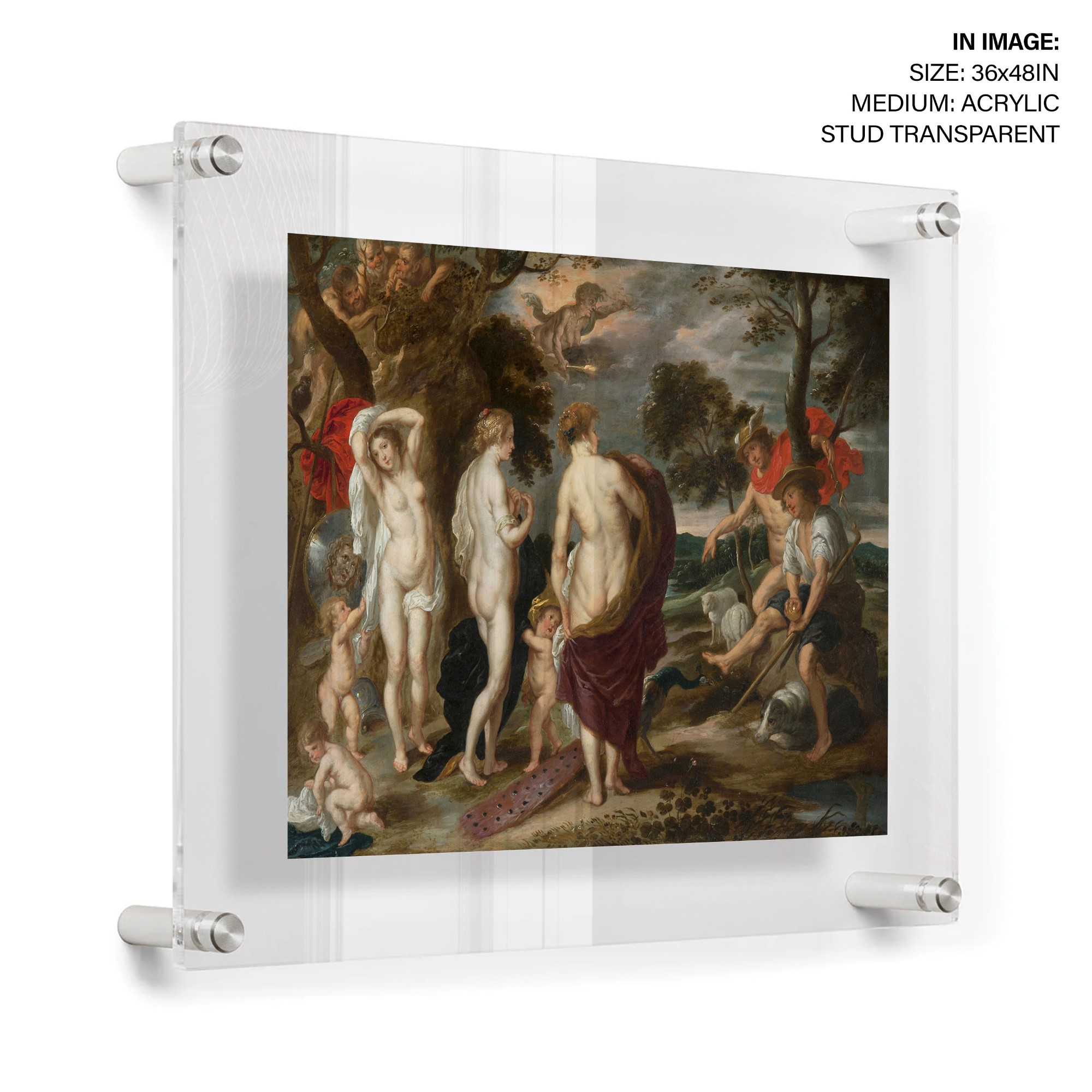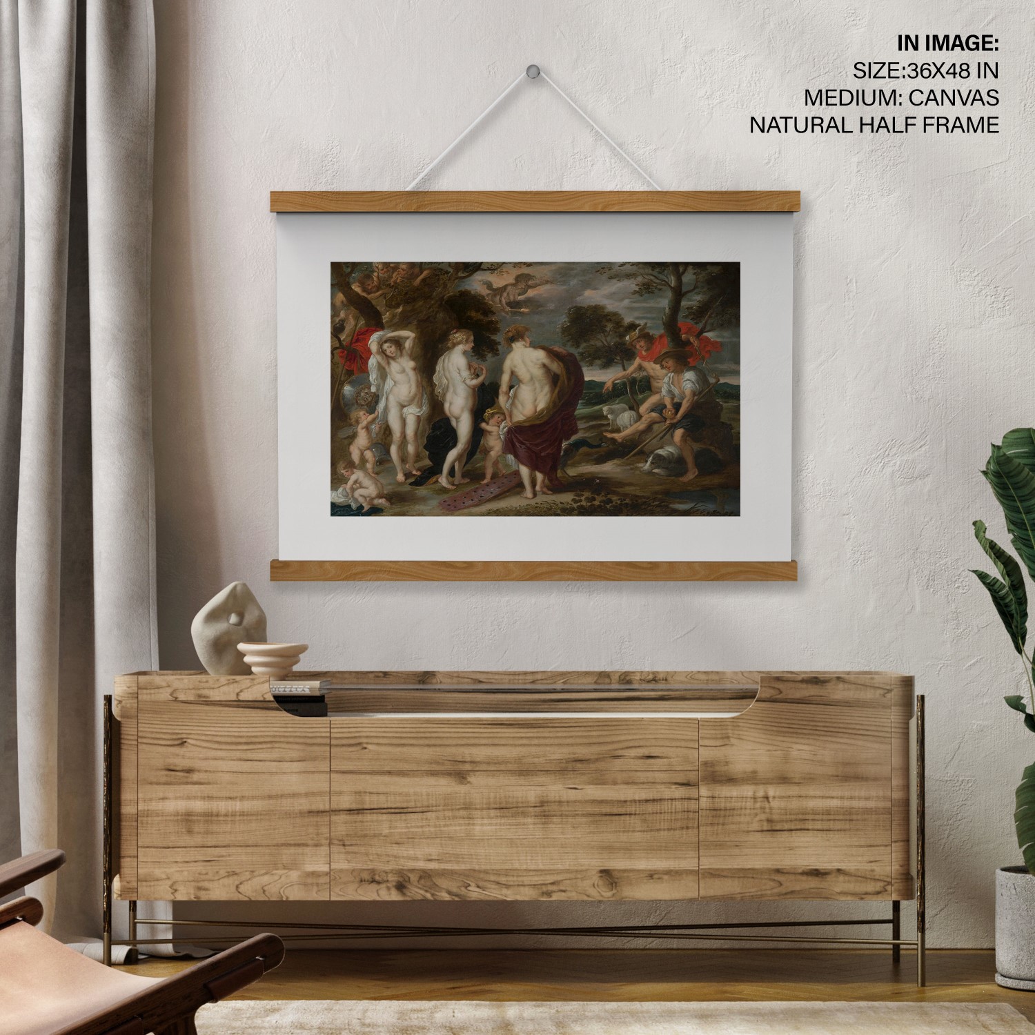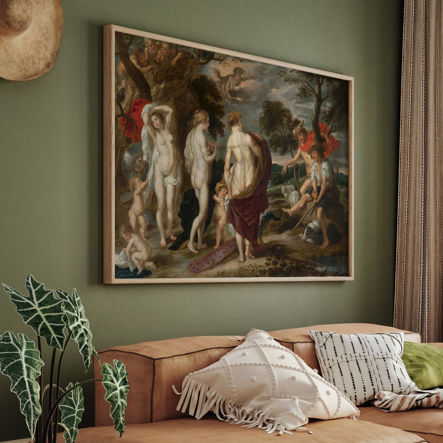 The painting depicts the moment when Hermes asks the goddess Aphrodite to reveal herself to show her beauty to Paris, who will give the golden apple to the most beautiful of the Olympian deities. This myth narrates how the Trojan War was unleashed after giving it to the exuberant Aphrodite. The helmet, the shield with the face of Medusa,