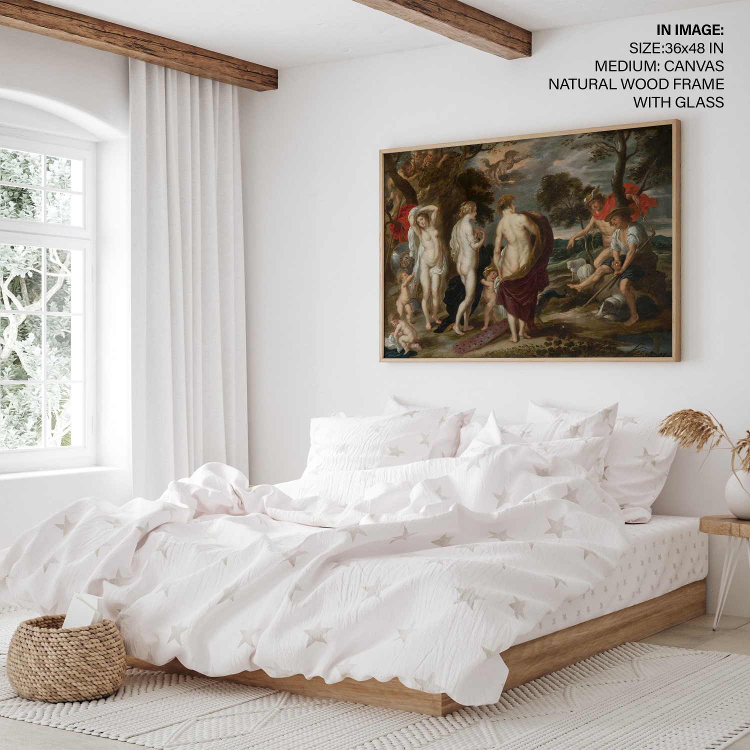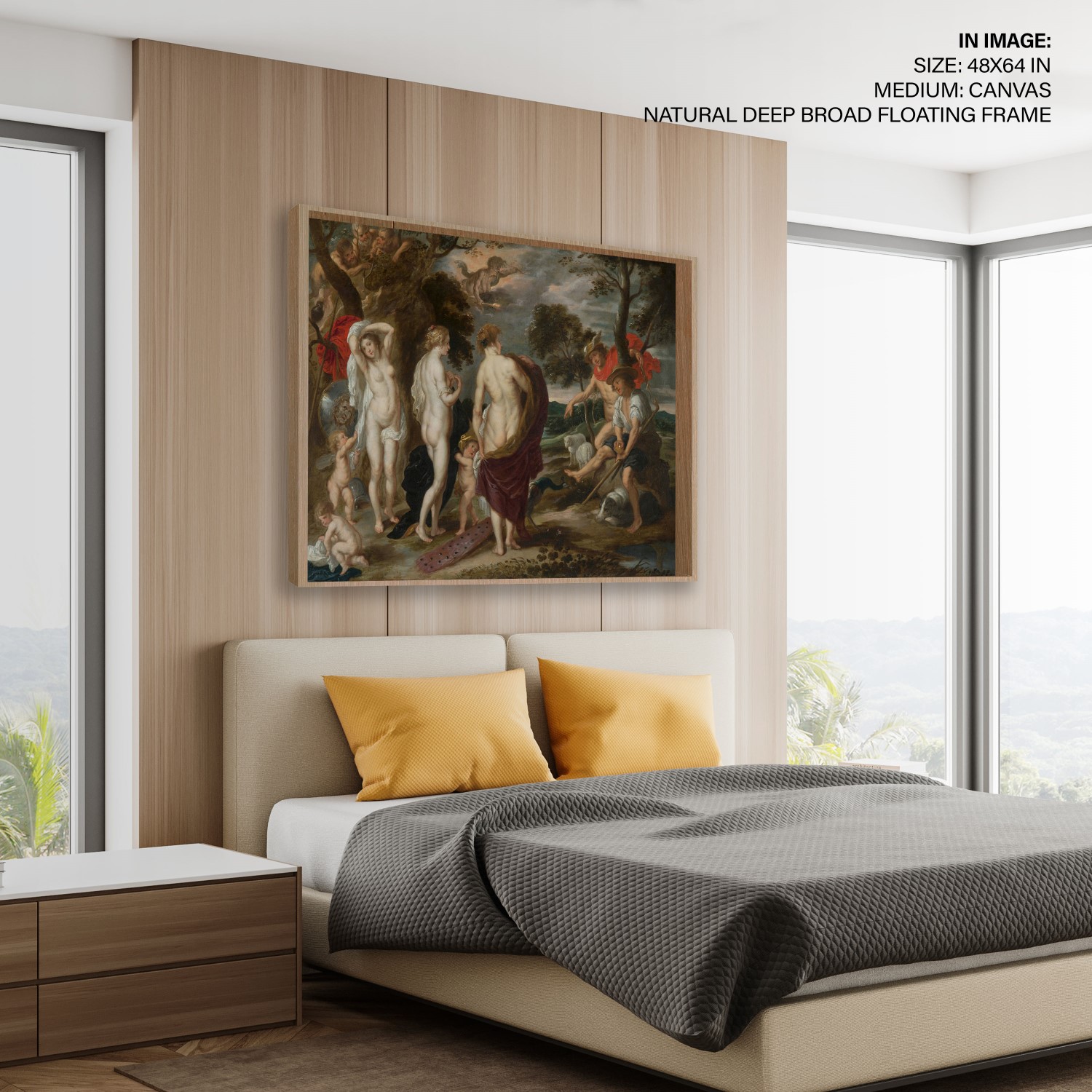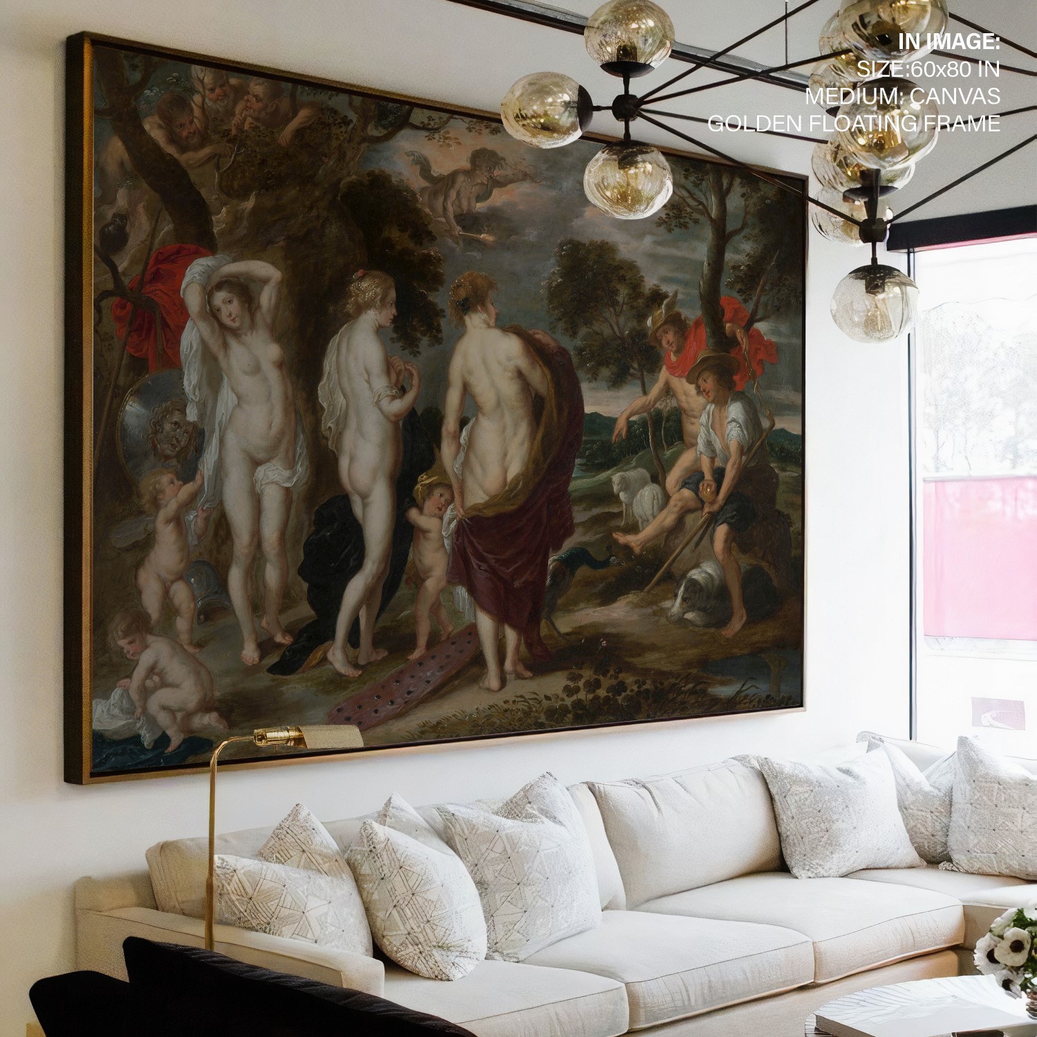 The painting depicts the moment when Hermes asks the goddess Aphrodite to reveal herself to show her beauty to Paris, who will give the golden apple to the most beautiful of the Olympian deities. This myth narrates how the Trojan War was unleashed after giving it to the exuberant Aphrodite. The helmet, the shield with the face of Medusa,