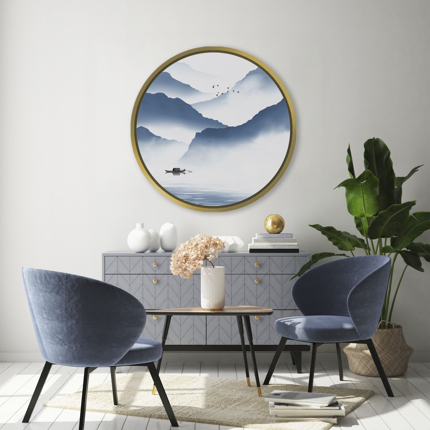 Indigo mountainscape #154 – Circular Wooden Frame
