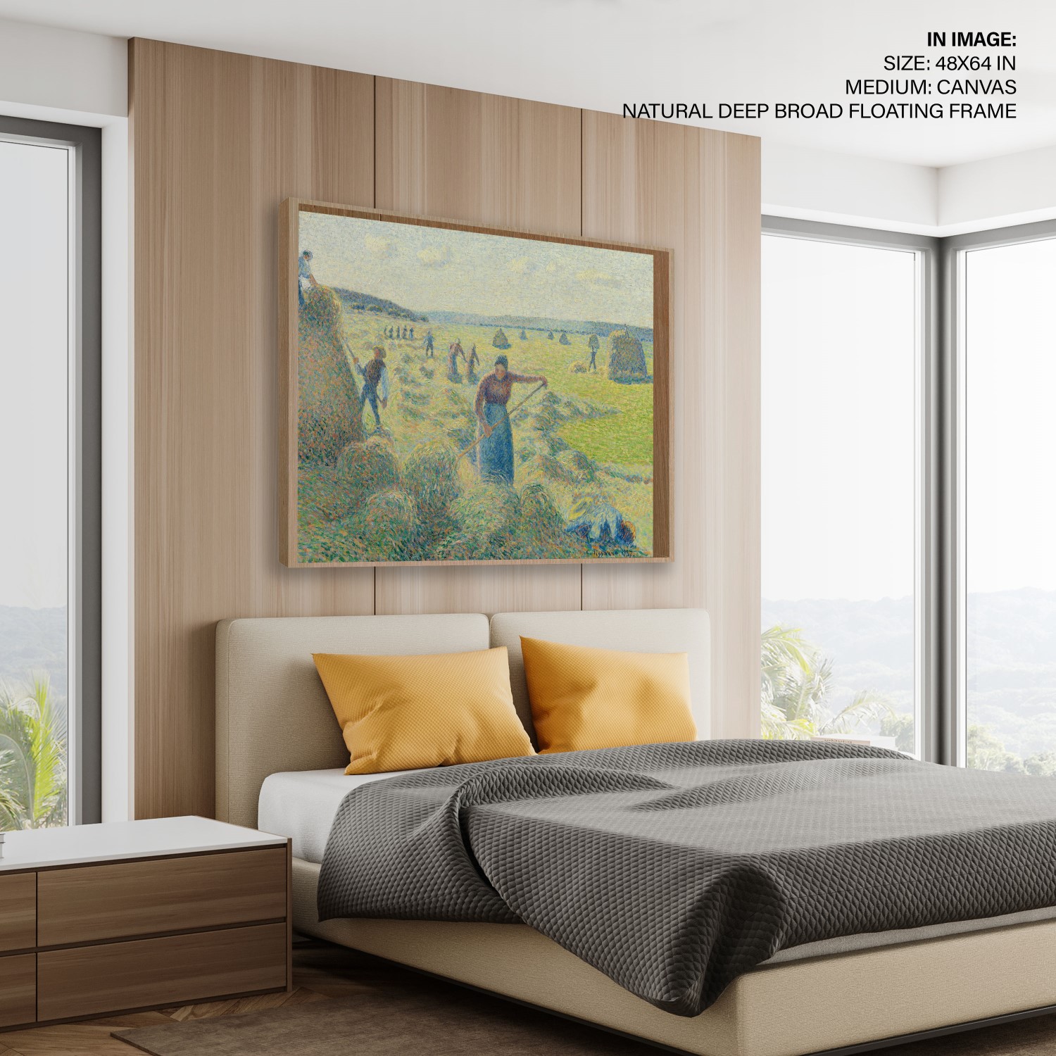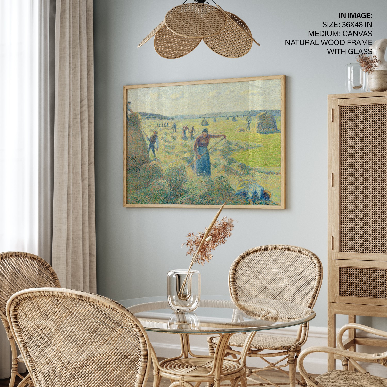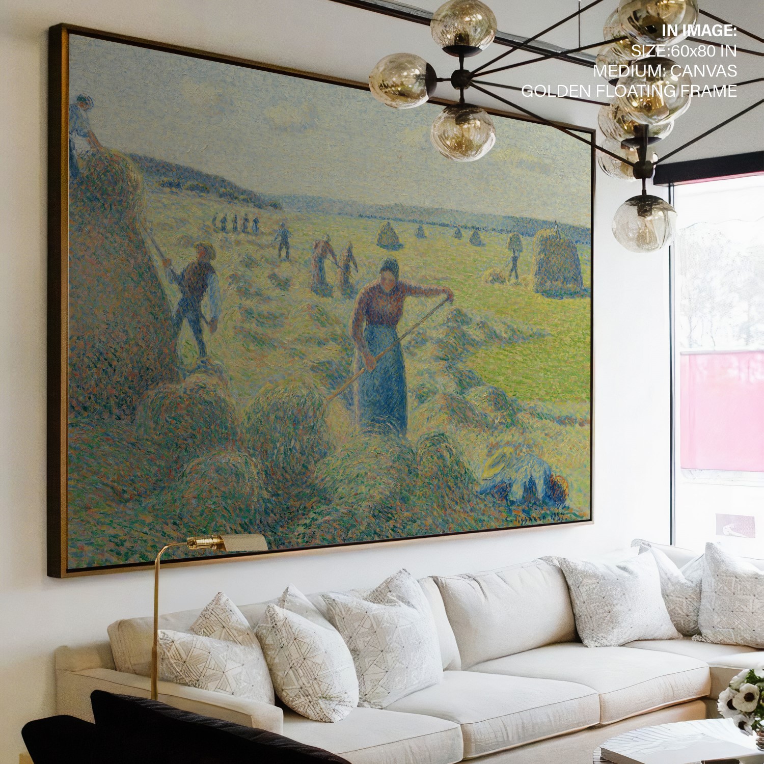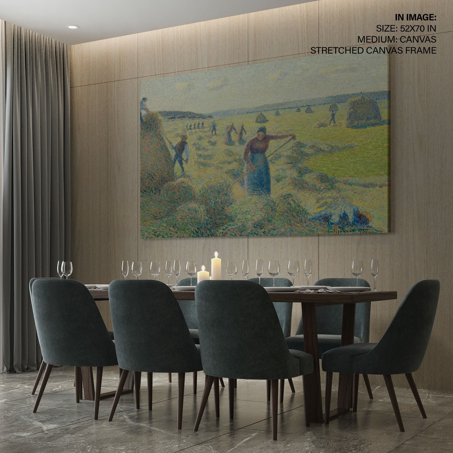 This painting, The haymaking, Éragny, captures the bustling haying season in rural Éragny, where Pissarro lived with his family from 1884 until his death in 1903. The canvas clearly shows how the artist used his personal version of pointillism to enhance the colour effects and luminosity of his work. From a distance, Pissarro’s colour palette, applied in systematic dots and dabs, form a unity and increase the painting’s light and colour intensity.
