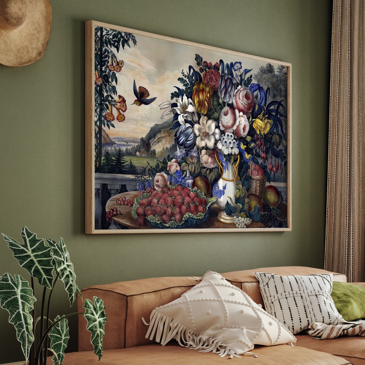 English artist Frances Flora Bond (Fanny) Palmer was already an illustrator working with her printmaker husband before immigrating to New York and joining Currier & Ives. She specialized in flower pictures and scenes of the Hudson River, and here she combines the two. The dense bouquet and fruit reference Dutch Old Masters and also her contemporary influenced by them, Severin Roesen. Only the most elaborate paintings of this genre included landscape beyond and Palmer bathes her scene in an overall cheerful light quite unlike those dark precedents. The hummingbird