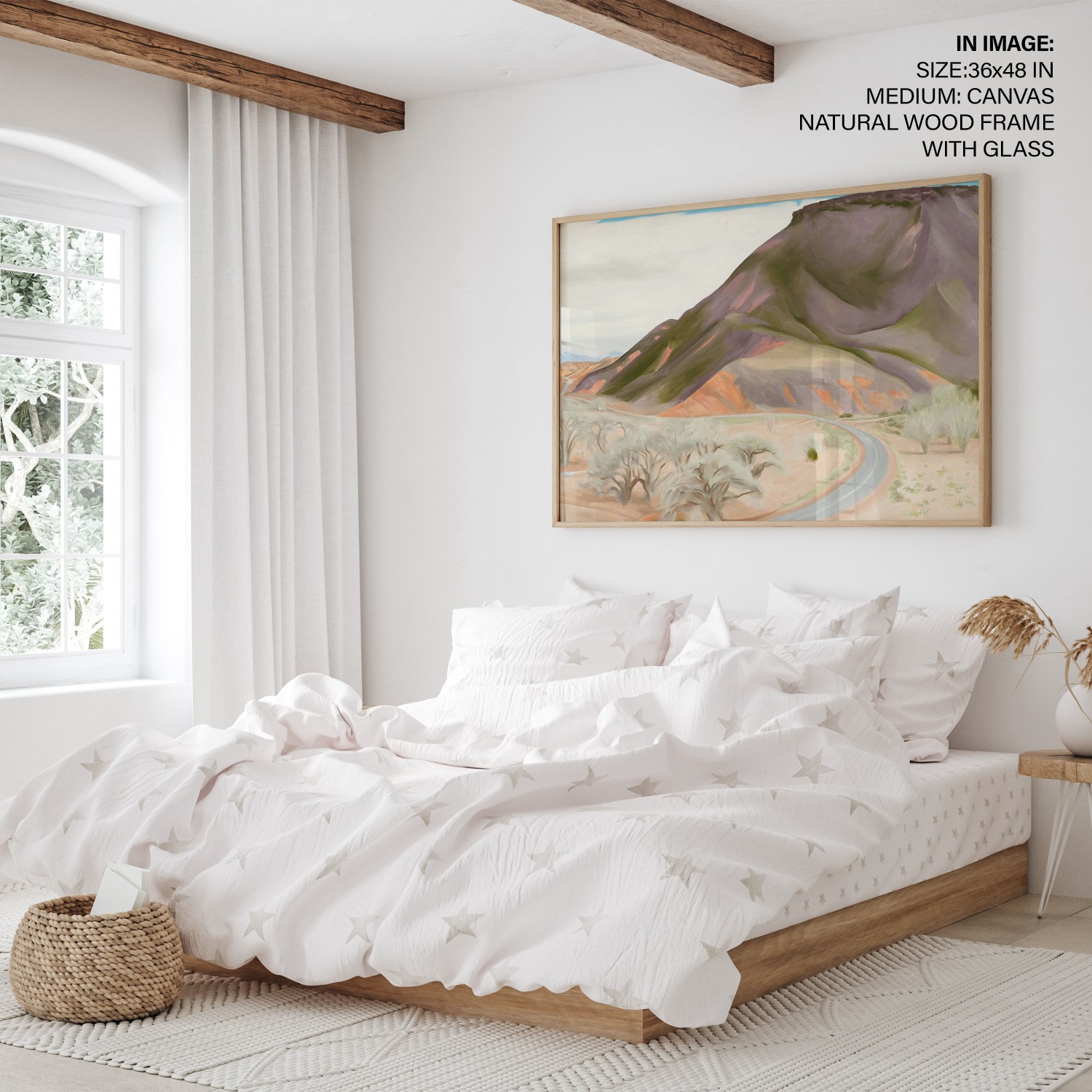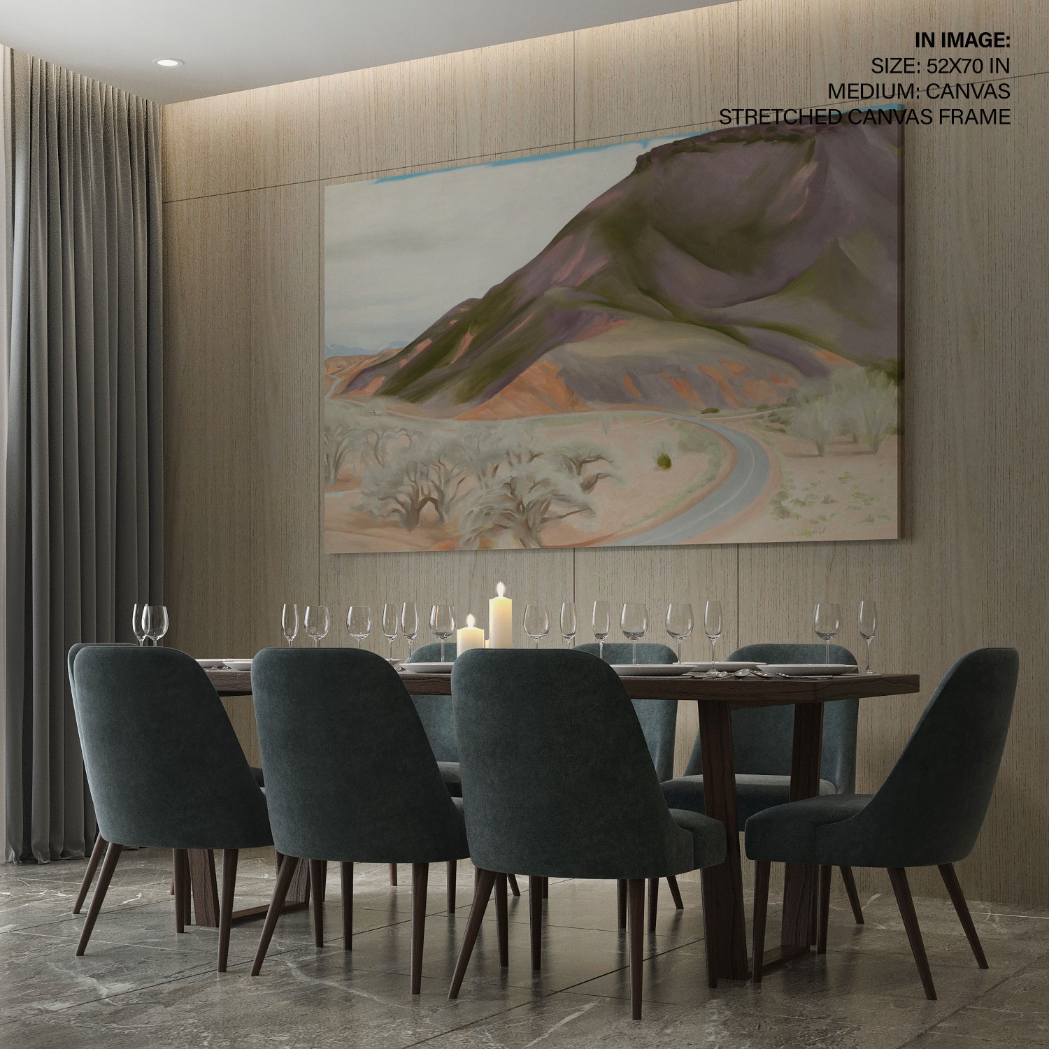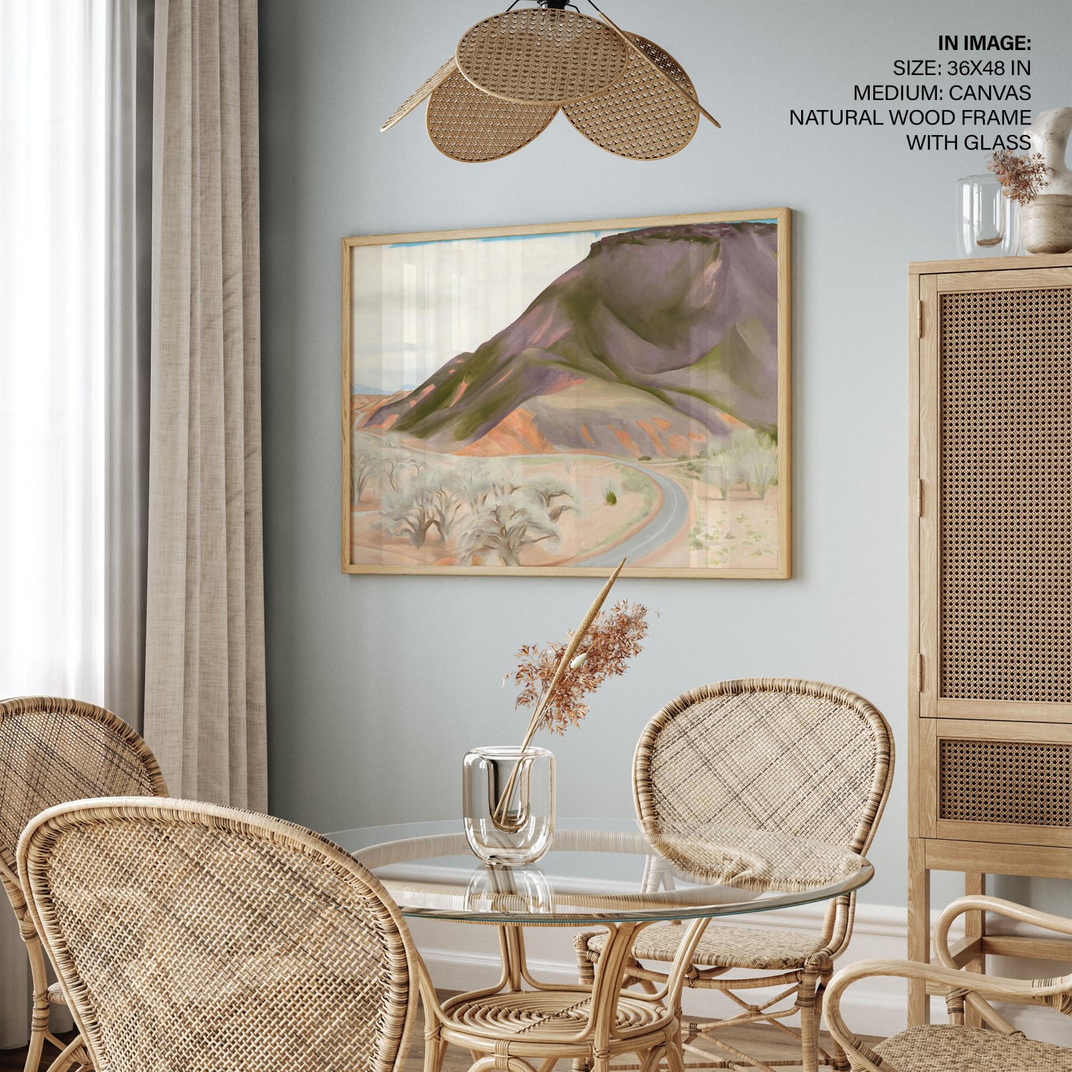 Mesa and Road East is a painting by Georgia O’Keeffe created in 1952. The oil on canvas artwork measures 26 1/16 x 36 inches. The painting depicts a mesa and a road in the east. Georgia O’Keeffe was an American artist known for her paintings of enlarged flowers, New York skyscrapers, and New Mexico landscapes. She was a prominent figure in the art world and played a significant role in the development