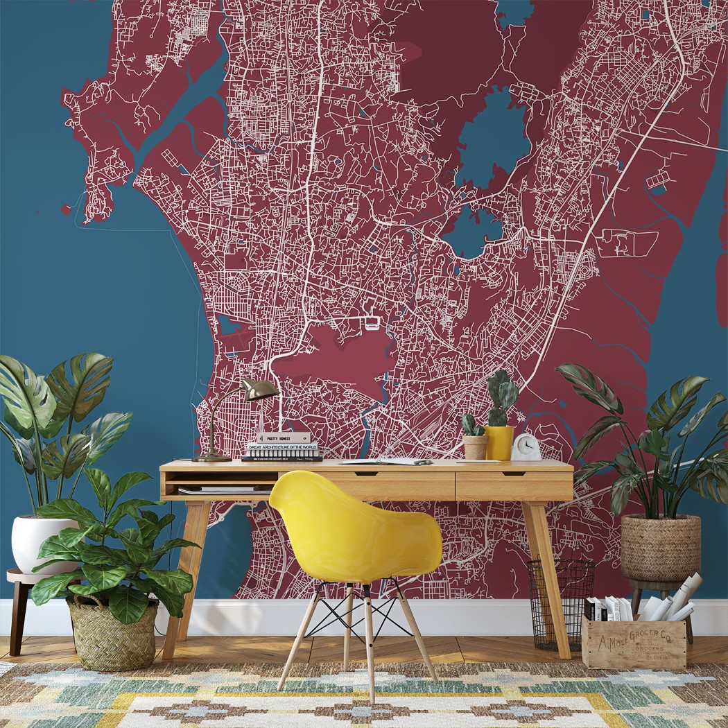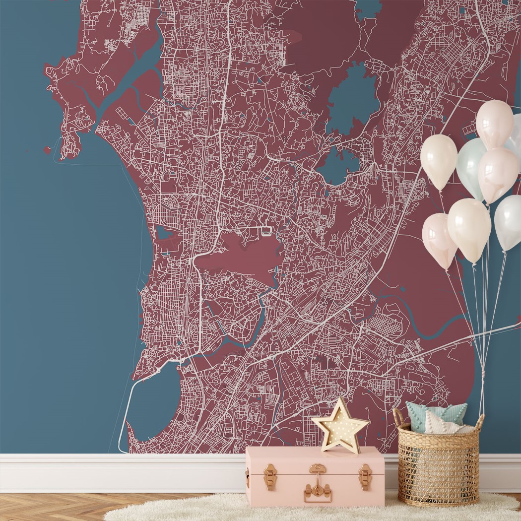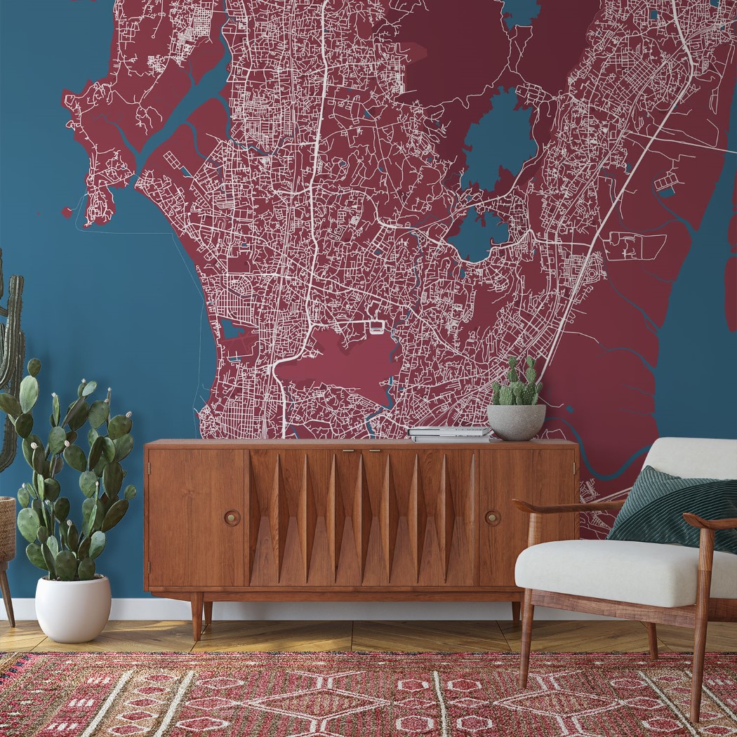 Mumbai Map Wall Mural – Red blue, Mural Wallpaper, PVC Free, Non-Toxic