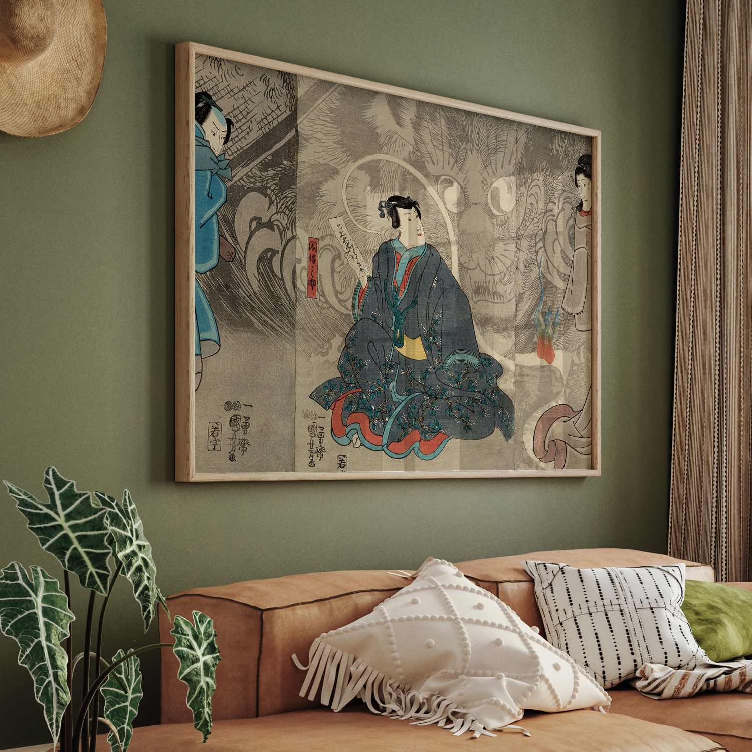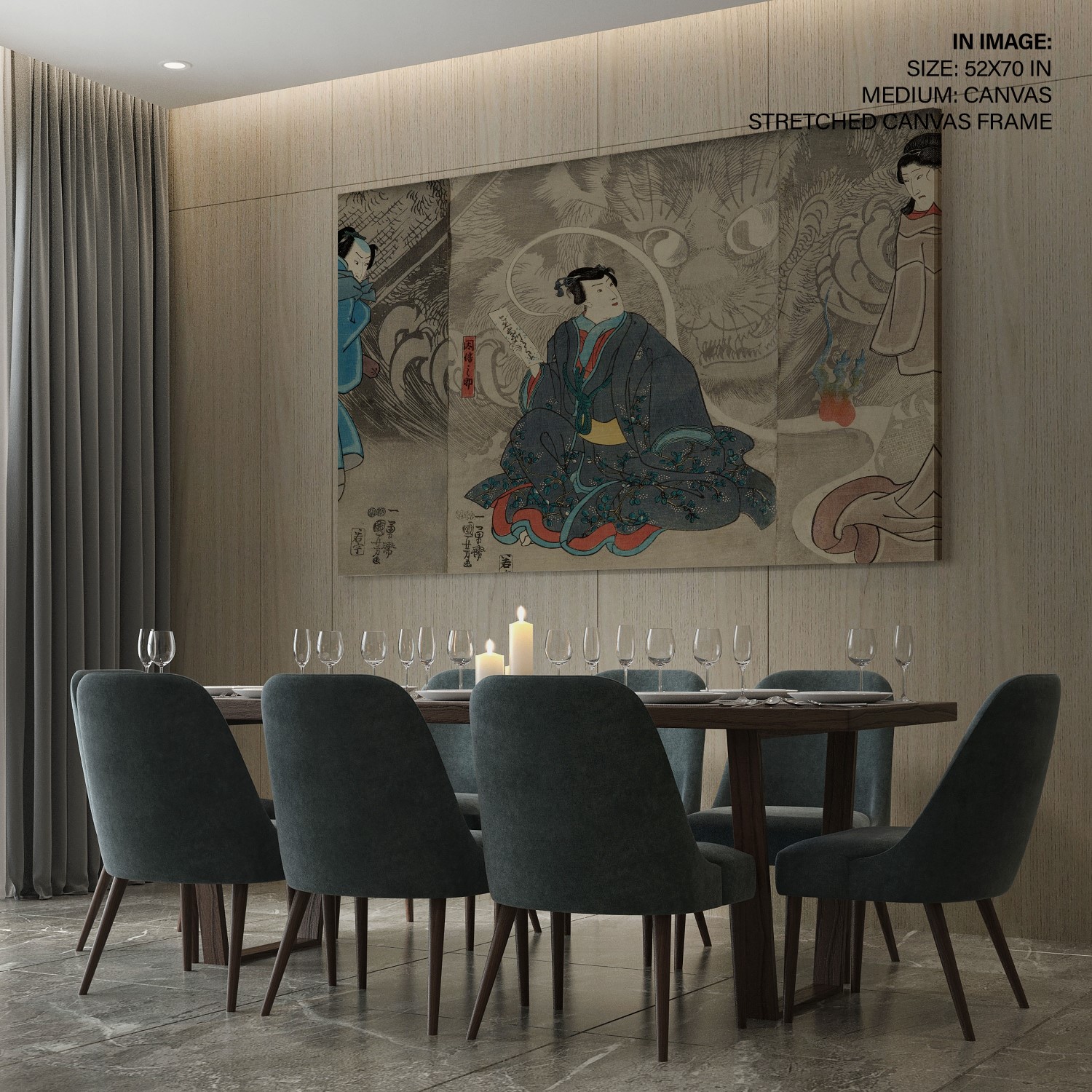 Scene from a Ghost Story: The Okazaki Cat Demon is a woodblock printed triptych created by Utagawa Kuniyoshi during the Edo period. The artwork depicts a scene from a ghost story featuring the Okazaki Cat Demon. The demon is shown in the center panel, with a woman and