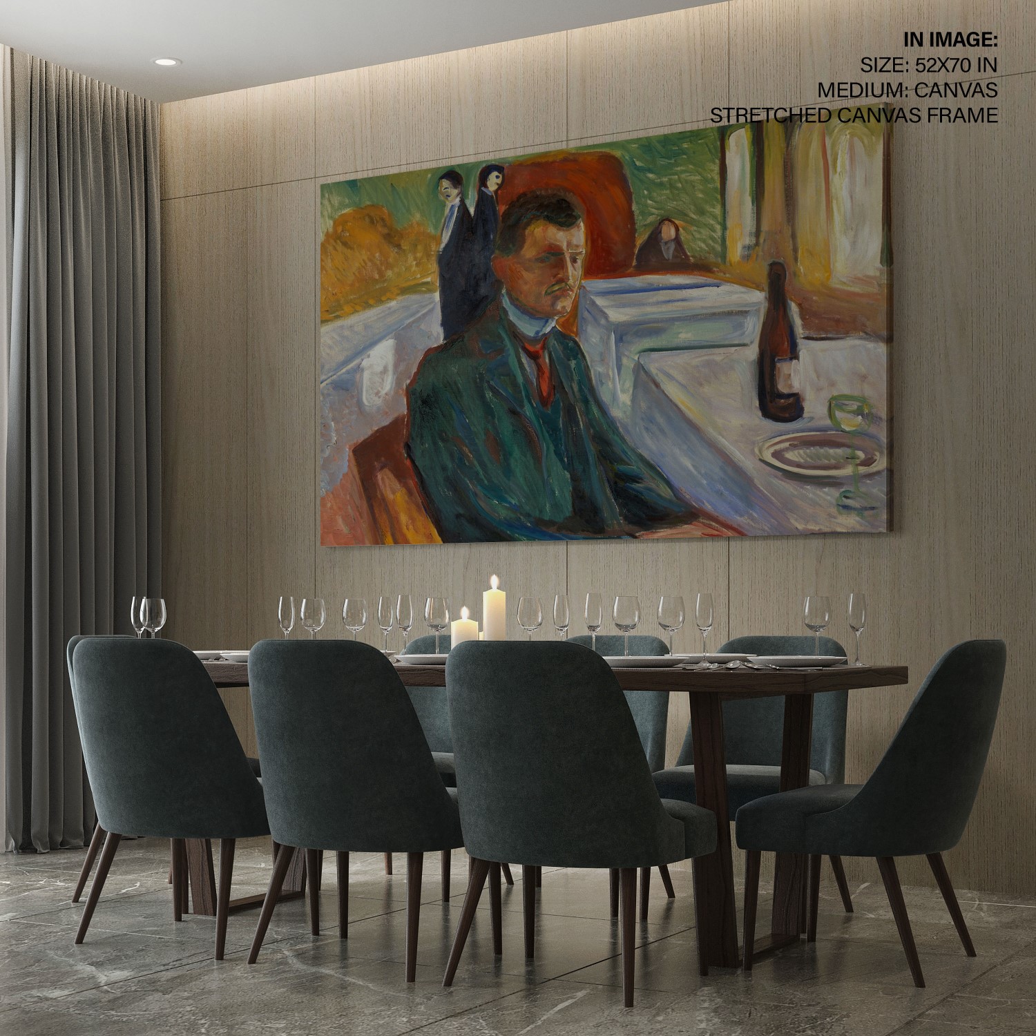 Self-Portrait with a Bottle of Wine is a painting by Edvard Munch, created in Weimar in 1906. The painting depicts the artist sitting alone at a table with a bottle of wine, a glass, and a plate. The hunched figure and weak folded hands express utter helplessness. The sloping lines create a strong depth perspective in the picture, with the head in the center where all the lines meet. The use of colors creates a tense and claustrophobic atmosphere, with a strong red color behind the artist’s head creating a movement forward and drawing attention to the head. Two figures resembling waiters are standing back-to-back in the background, pictured as having a shared body and almost seeming to have grown out of Munch’s own body. The two heads, each looking in different directions, can be interpreted as metaphors for opposing forces in the artist’s soul