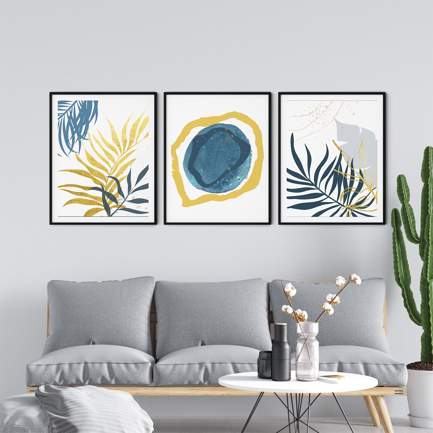 Set of 3 blue gold leaves minimalistic