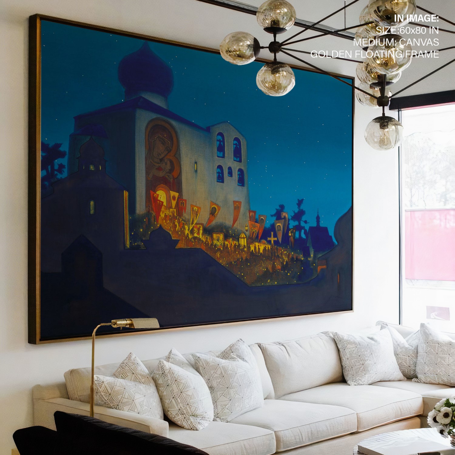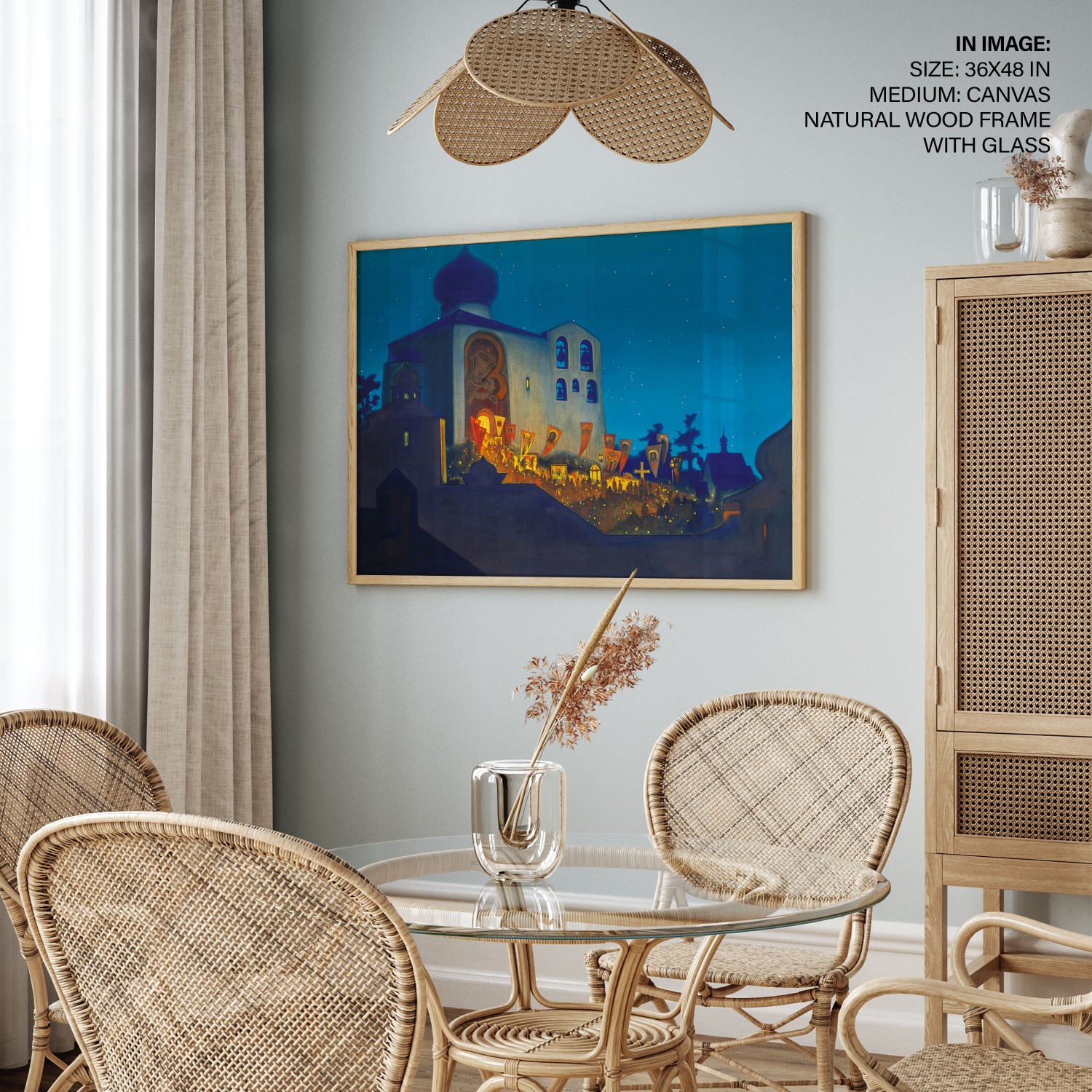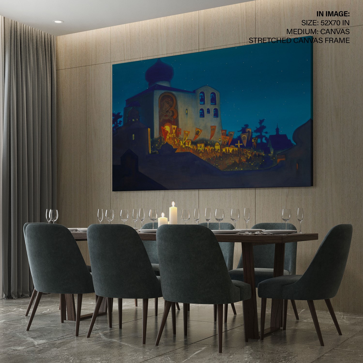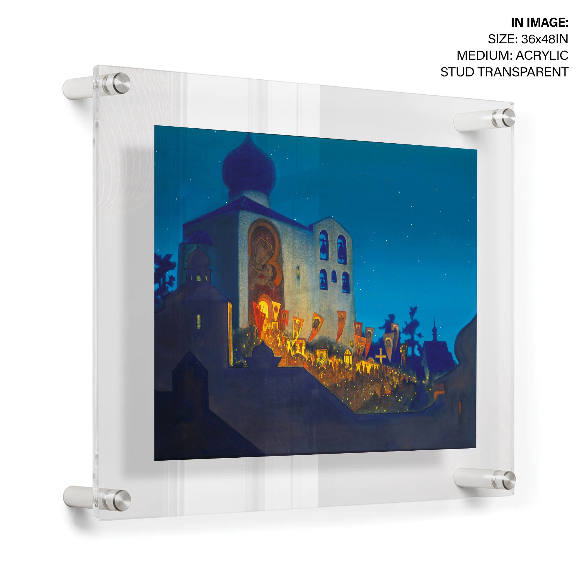 The painting depicts a Cross procession during the Orthodox Easter service. The Cathedral is built in the Pskov architectural school tradition. People with lighted candles are coming out from the Cathedral carrying Holy Banners and candles, their light merging with that of the stars above. The Temple is brightly illuminated inside, and particles of this light are brought out by the Cross procession. The intensity of this light is emphasized by the thick shadows covering the constructions depicted in the foreground. It is not only the light of candles that illuminates this painting but the light of human hearts that were opened on this night to receive the idea of the Highest World. It is shining all around, bringing people closer to Heaven and bringing the Highest World closer to the Earth.