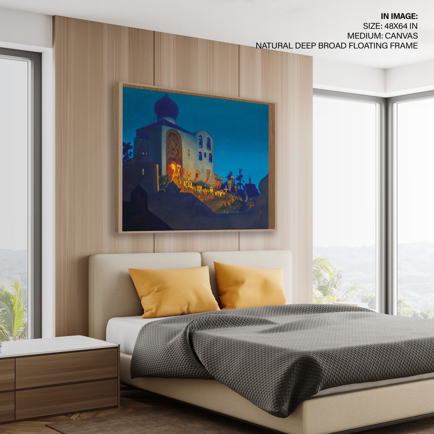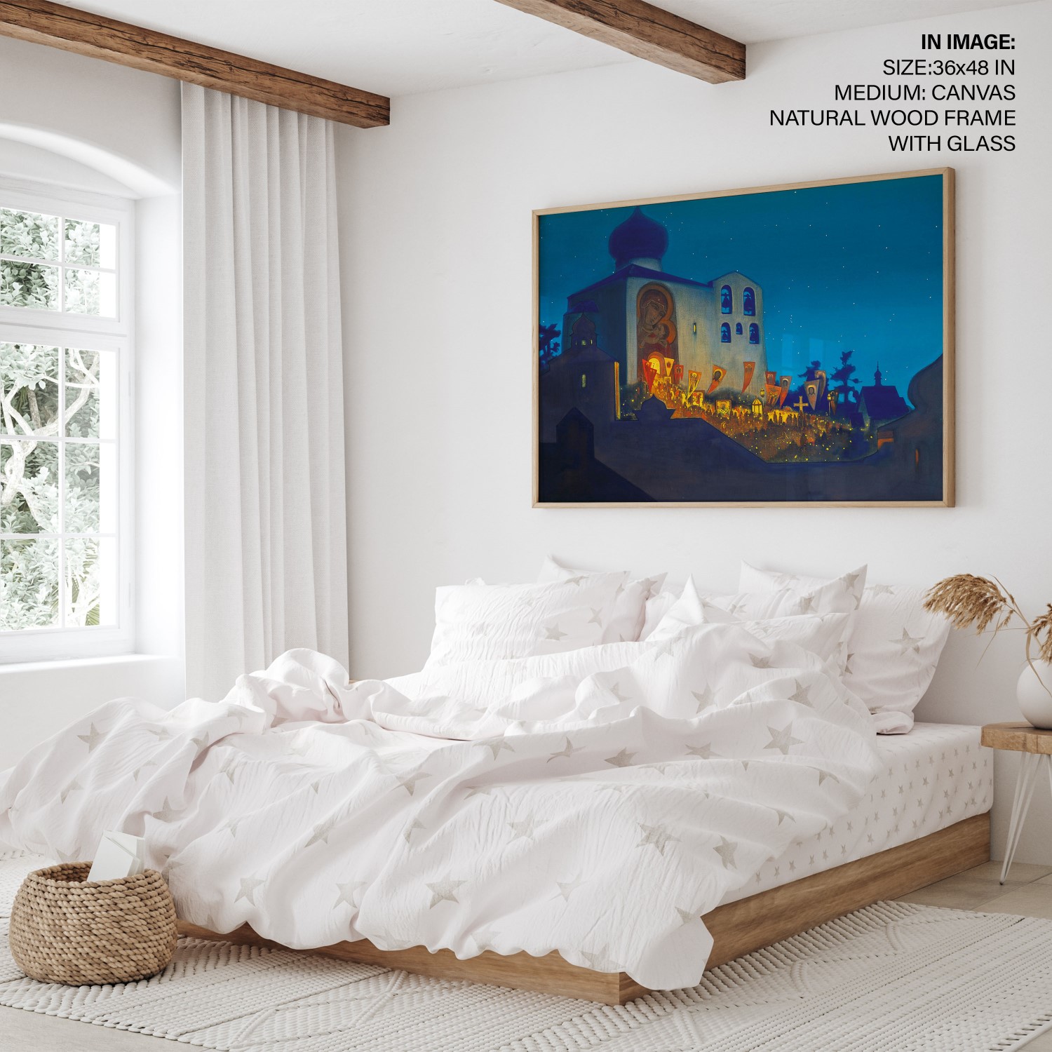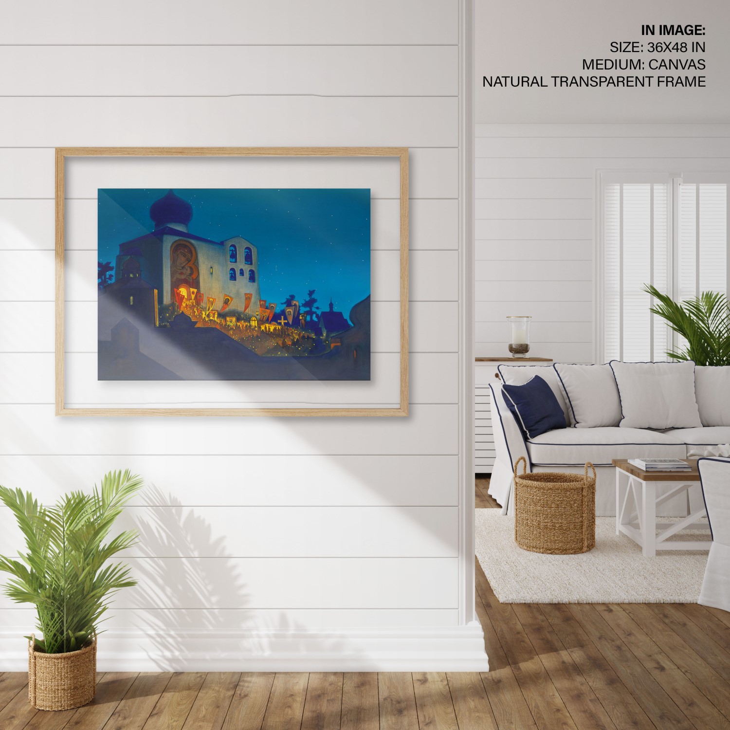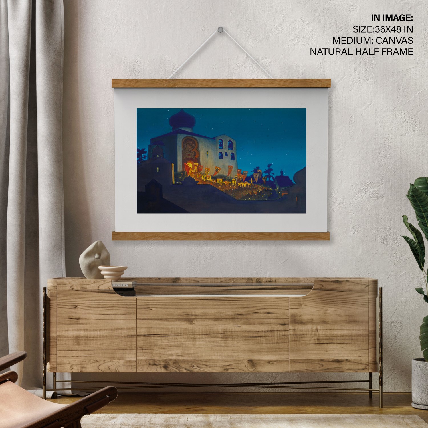 The painting depicts a Cross procession during the Orthodox Easter service. The Cathedral is built in the Pskov architectural school tradition. People with lighted candles are coming out from the Cathedral carrying Holy Banners and candles, their light merging with that of the stars above. The Temple is brightly illuminated inside, and particles of this light are brought out by the Cross procession. The intensity of this light is emphasized by the thick shadows covering the constructions depicted in the foreground. It is not only the light of candles that illuminates this painting but the light of human hearts that were opened on this night to receive the idea of the Highest World. It is shining all around, bringing people closer to Heaven and bringing the Highest World closer to the Earth.
