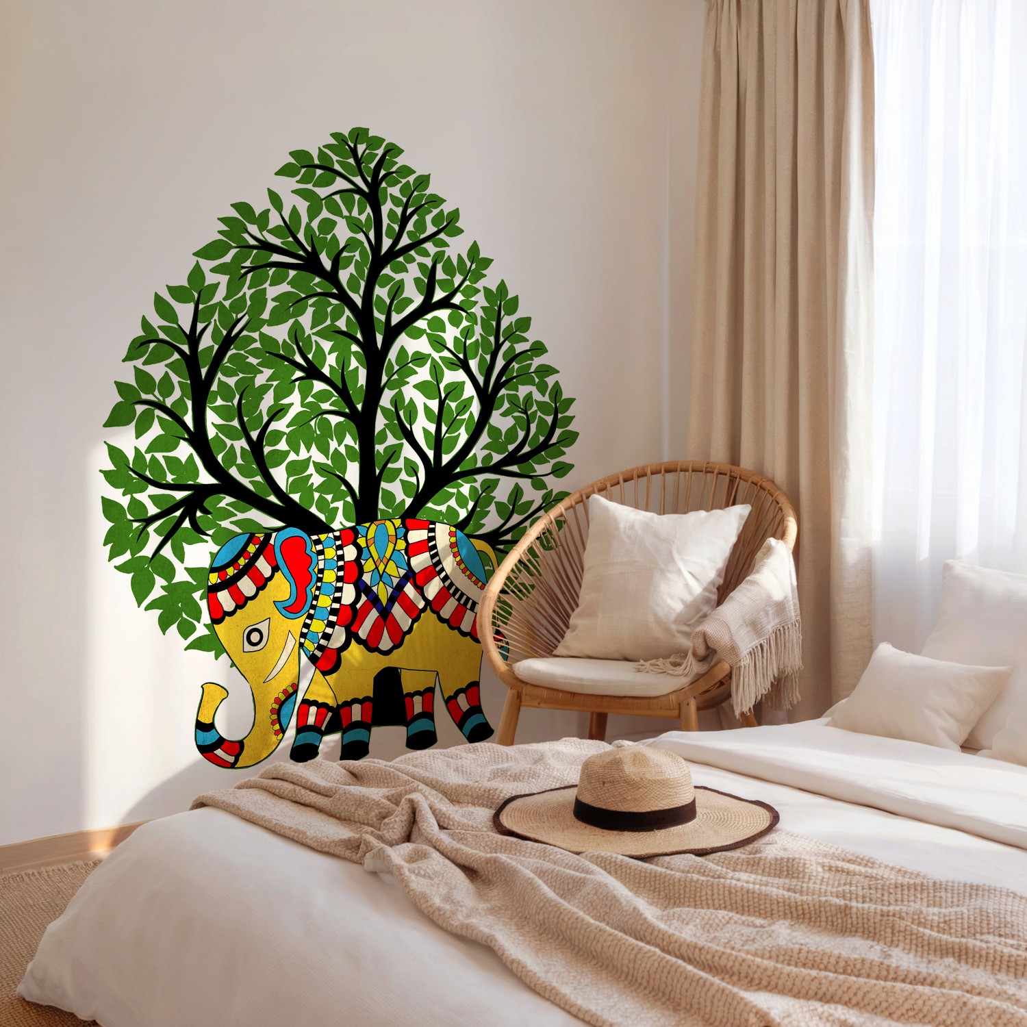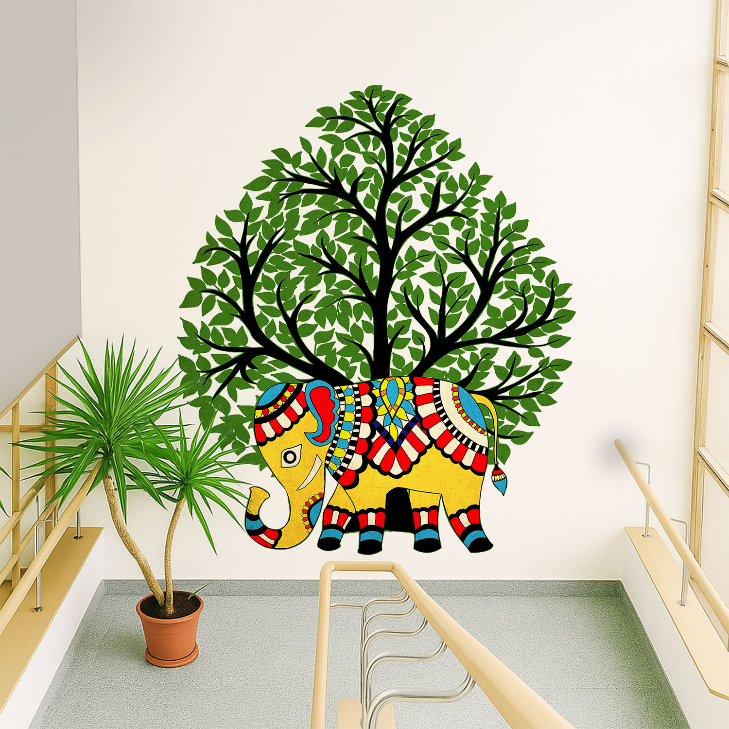 Elephant Amidst the Lush Tree: A Colorful Madhubani Masterpiece